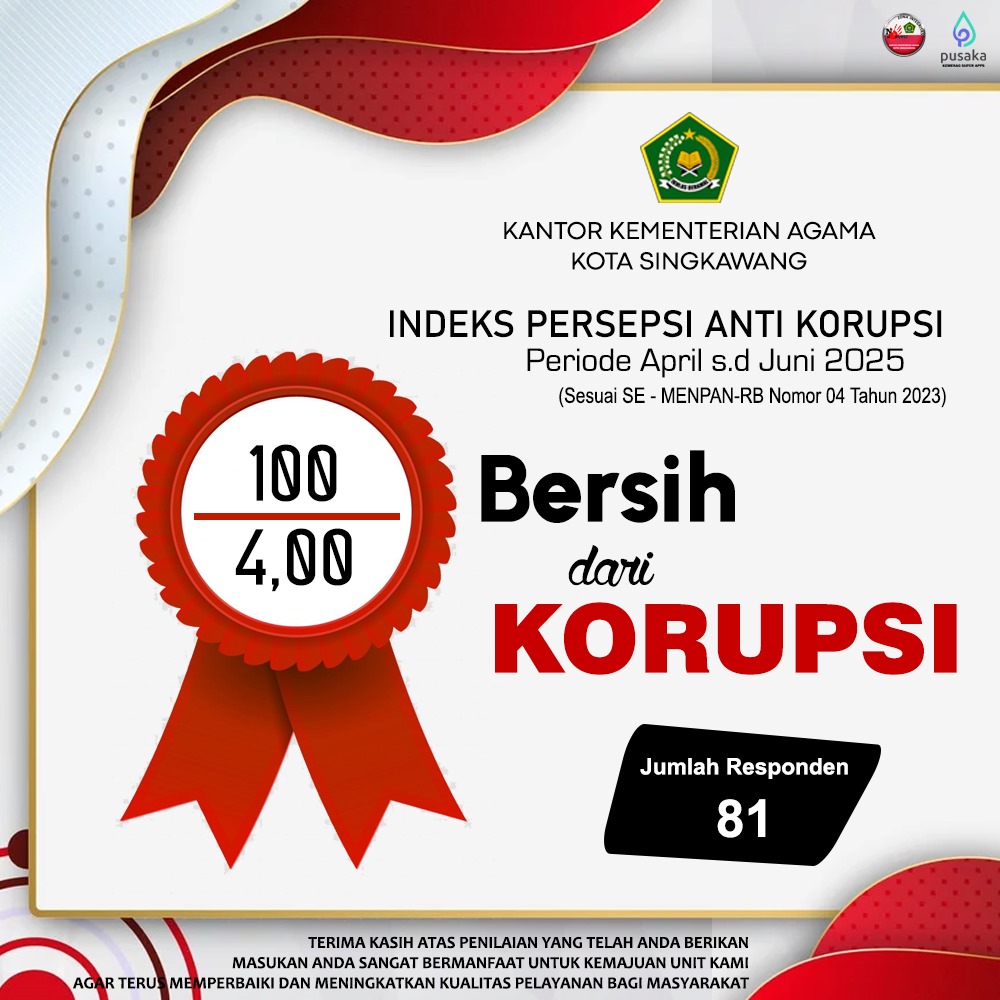 Hasil membanggakan ini dalam upayanya mewujudkan tata kelola pemerintahan yang bersih danterpercaya. Berdasarkan hasil Survei Indeks Persepsi Anti Korupsi (IPAK) Triwulan II Tahun 2025 (Periode April–Juni), Kemenag Singkawang berhasil meraih nilai sempurna 100, atau setara 4,00 padaskala 4, yang masuk dalam kategori Bersih dari Korupsi (A)” sesuai ketentuan SE-MENPAN-RB Nomor 04 Tahun 2023.