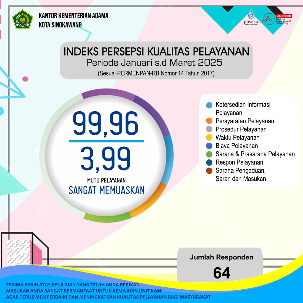 Survei ini melibatkan 64 responden yang terdiri dari masyarakat pengguna layanan. Penilaian mereka menjadi masukan berharga untuk mengevaluasi dan meningkatkan kualitas pelayanan yang diberikan. Hasil ini bukan hanya angka, tetapi juga cerminan dari kerja keras, dedikasi, dan komitmen seluruh jajaran Kemenag Singkawang dalam menjawab harapan publik.