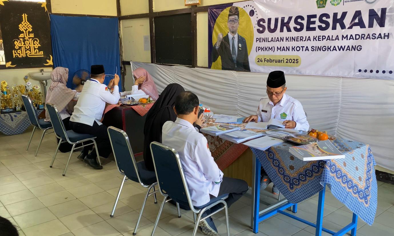 Singkawang (Kemenag) – Penilaian Kinerja Kepala Madrasah (PKKM) di MAN Kota Singkawang berlangsung pada Senin (24/02) pagi dengan menghadirkan tim penilai dari pengawas madrasah, Hj. Idawati dan H. Ehwan. Kegiatan ini digelar di ruang guru dan dihadiri oleh Tim Kerja PKKM MAN Singkawang.