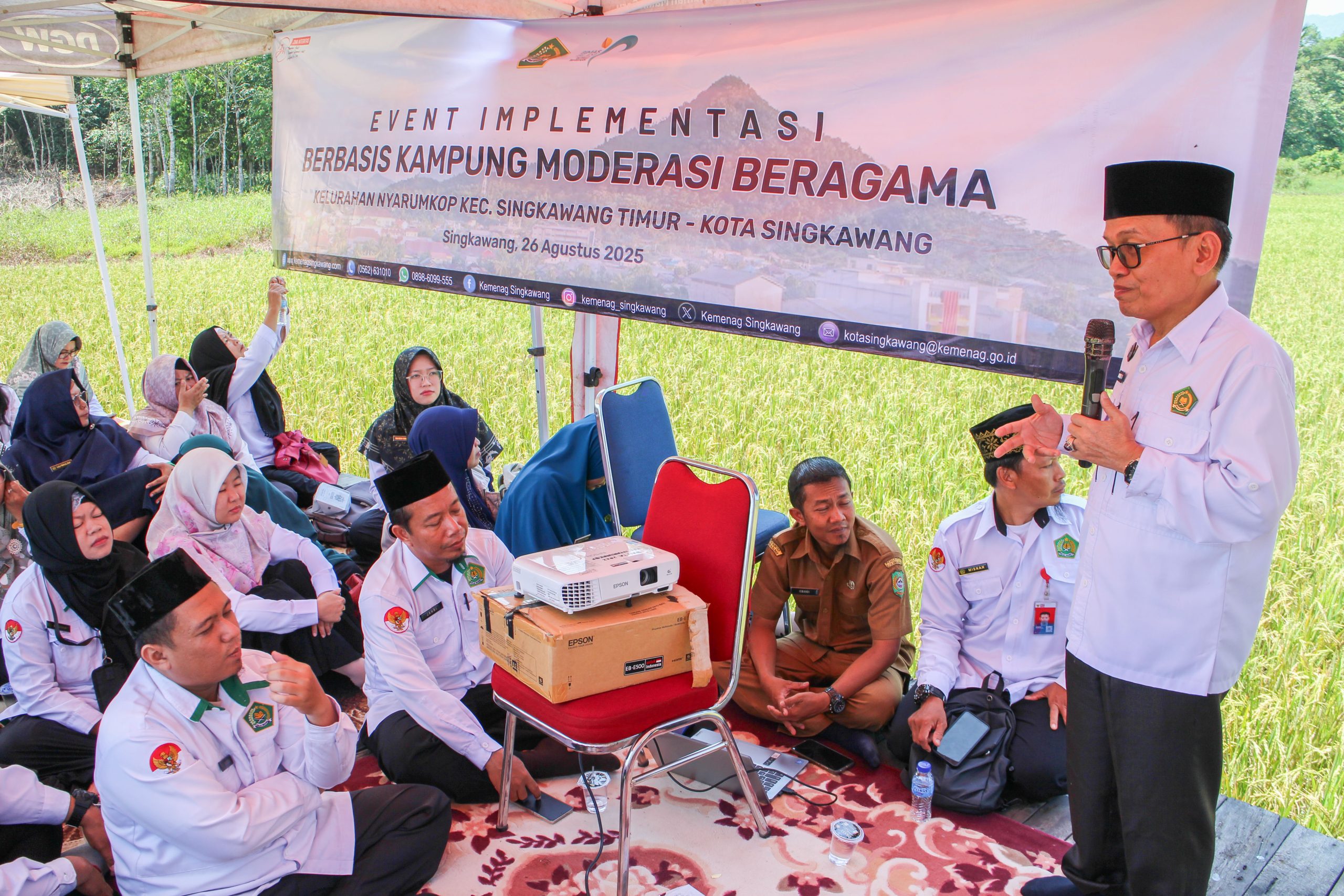Singkawang (Kemenag) – Semangat memperkuat toleransi dan kerukunan antar umat beragama di Kota Singkawang kembali ditegaskan melalui kegiatan Event Implementasi Berbasis Lokasi Kampung Moderasi Beragama yang dilaksanakan di Agro Edu Wisata Kelurahan Nyarumkop, Kecamatan Singkawang Timur pada Selasa (26/08). Dalam suasana pemandangan gunung yang indah dengan hamparan sawah dan pohon yang hijau sebanyak 60 peserta yang terdiri dari penyuluh agama, tokoh agama dan tokoh masyarakat hadir penuh semangat. Kegiatan yang digelar oleh Seksi Bimas Islam Kantor Kemenag Kota Singkawang ini menjadi bagian dari upaya konkret dalam memperkuat nilai-nilai moderasi beragama. Kegiatan ini juga dihadiri Camat Singkawang Timur, Danramil 1202/04 Singkawang Timur, Kapolsek Singkawang Timur, Kepala KUA se Kota Singkawang, Lurah Nyarumkop, serta Plt Ketua FKUB Kota Singkawang